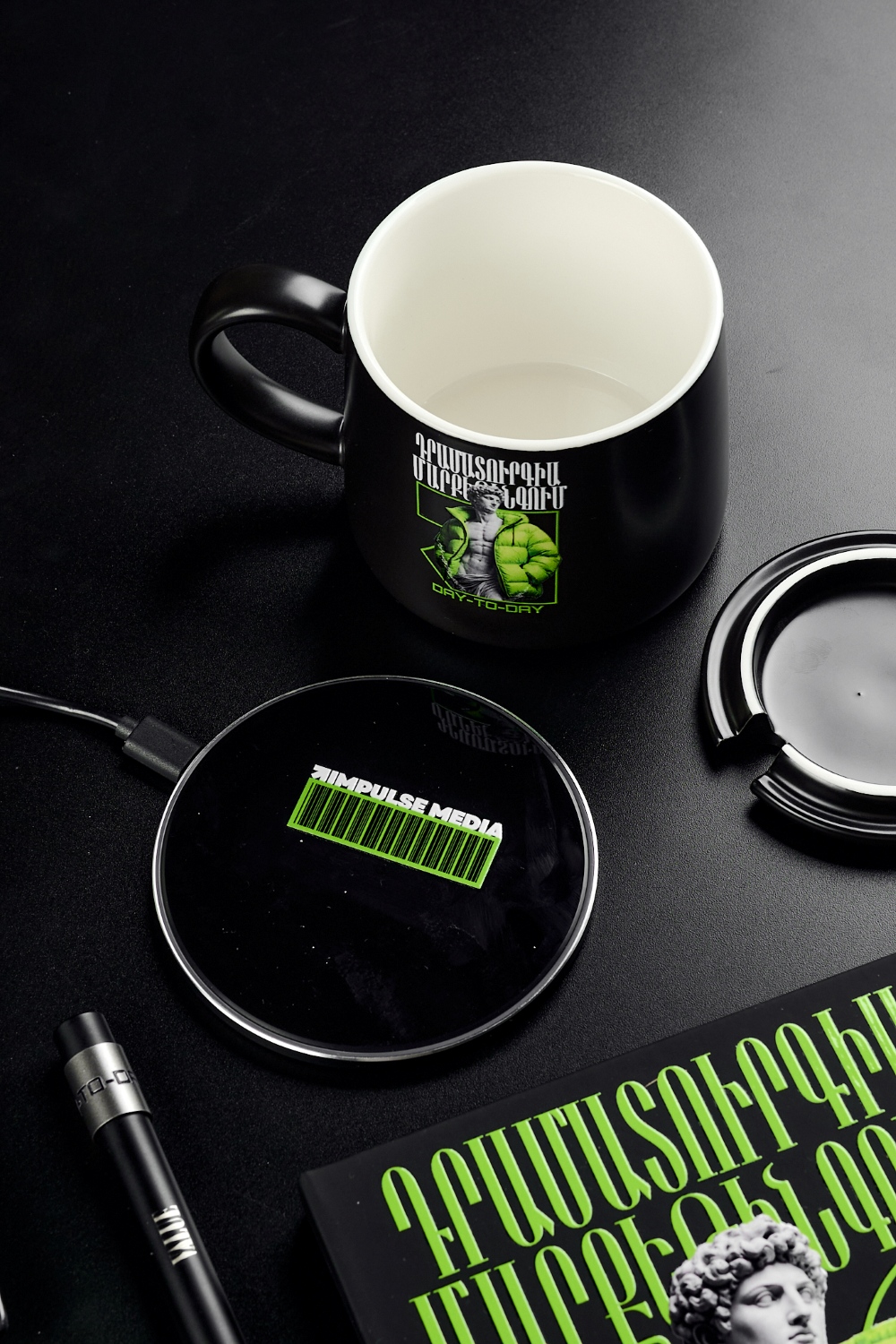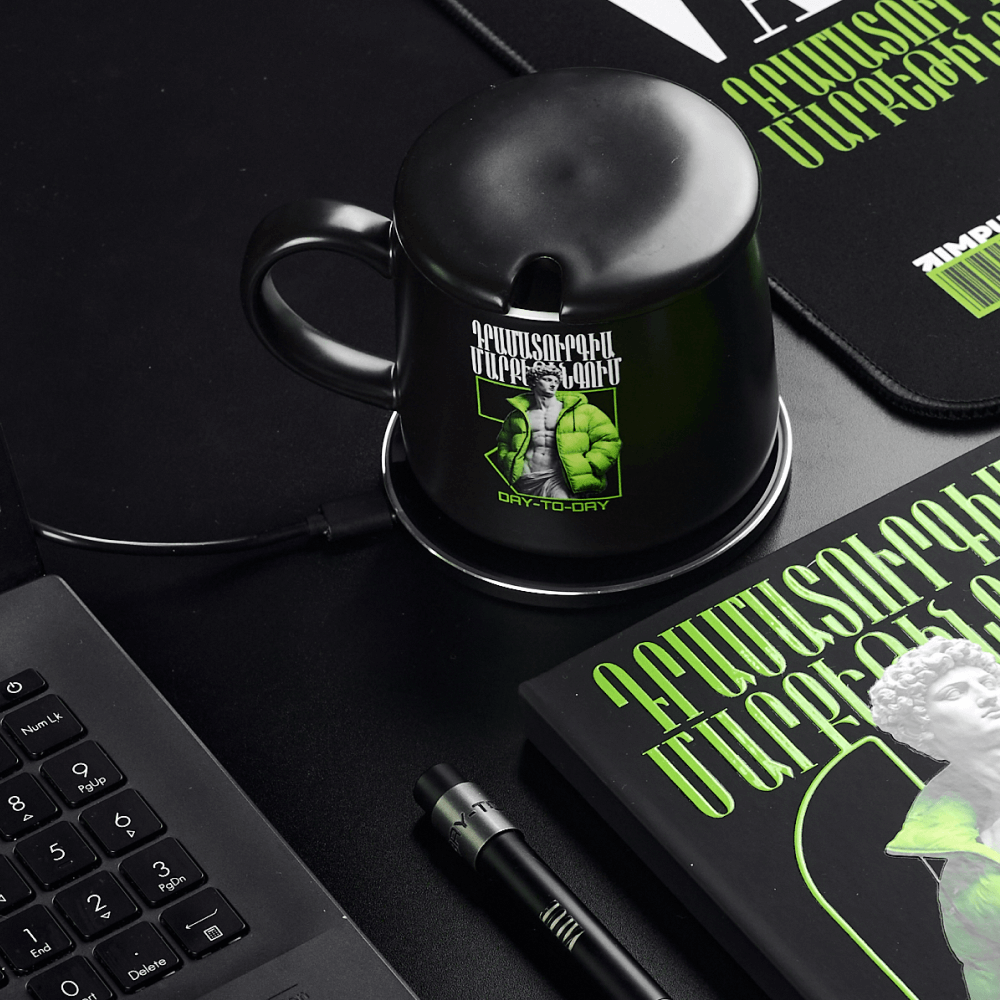 Отдельный акцент сделан на двойном брендировании кружки: на базе для зарядки ярко выделяется логотип, а на самом изделии — главное изображение сета с подписью day-to-day. Визуально цельное и технологичное решение.