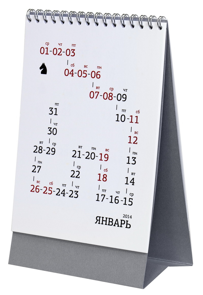 Послание на дизайнерской открытке скрыто и появляется только при правильном совмещении ее частей. А концептуальный настольный календарь, кроме функциональности, несет позитивный посыл, пробуждает желание действовать, удивлять и радовать. Календарная сетка выполнена в виде ходов шахматного коня, выходные дни выделены цветом. Каждый оборот — место для заметок или записи удачных «ходов конем».